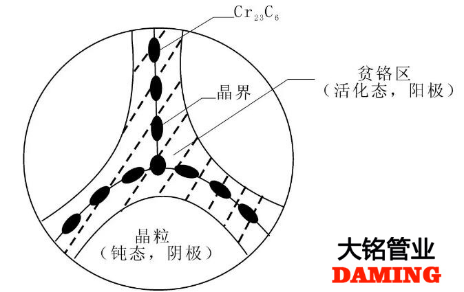 奧氏體不銹鋼在固溶處理時(shí),如果冷卻速度過(guò)慢,隨著溫度下降,碳原子在基體中的溶解度下降,碳化物便會(huì)析出。并且碳原子特別容易與鉻結(jié)合,形成M23C6型碳化物,分布在晶界上,晶界發(fā)生貧鉻現(xiàn)象,發(fā)生敏化。奧氏體不銹鋼發(fā)生敏化以后,應(yīng)在850ºC以上加熱,碳化物會(huì)固溶,再快速冷卻就能夠解決敏化問(wèn)題。